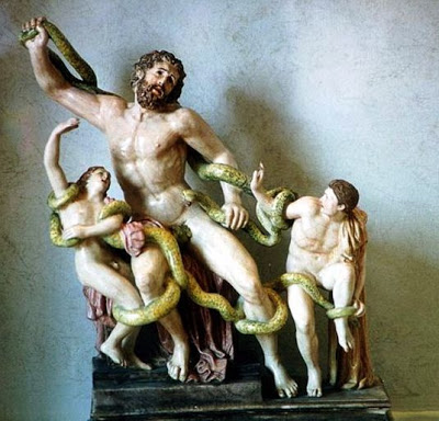 • poi afferrano il sacerdote, che accorre in difesa dei figli: lo stringono con 2 giri alla vita e si avvolgono per 2 volte intorno al suo collo con il corpo coperto di squame, mentre con gli alti colli sovrastano il suo capo