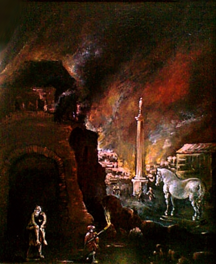 Raccolto un drappello di uomini, Enea nel buio della notte rossa di fiamme accorre al centro della città: uccidono un manipolo di Greci, si vestono delle loro armi e si mescolano tra i nemici, uccidendone molti o volgendoli in fuga, ma sono poi presi d'assalto dai Troiani e sono costretti a fuggire. Si dirigono alla reggia, ridotti ormai a due uomini con Enea stesso: sulla porta è PIRRO NEOTTOLEMO, il figlio di Achille, che la abbatte a colpi d'ariete e dà modo ai Greci di irrompere attraverso essa nelle stanze.